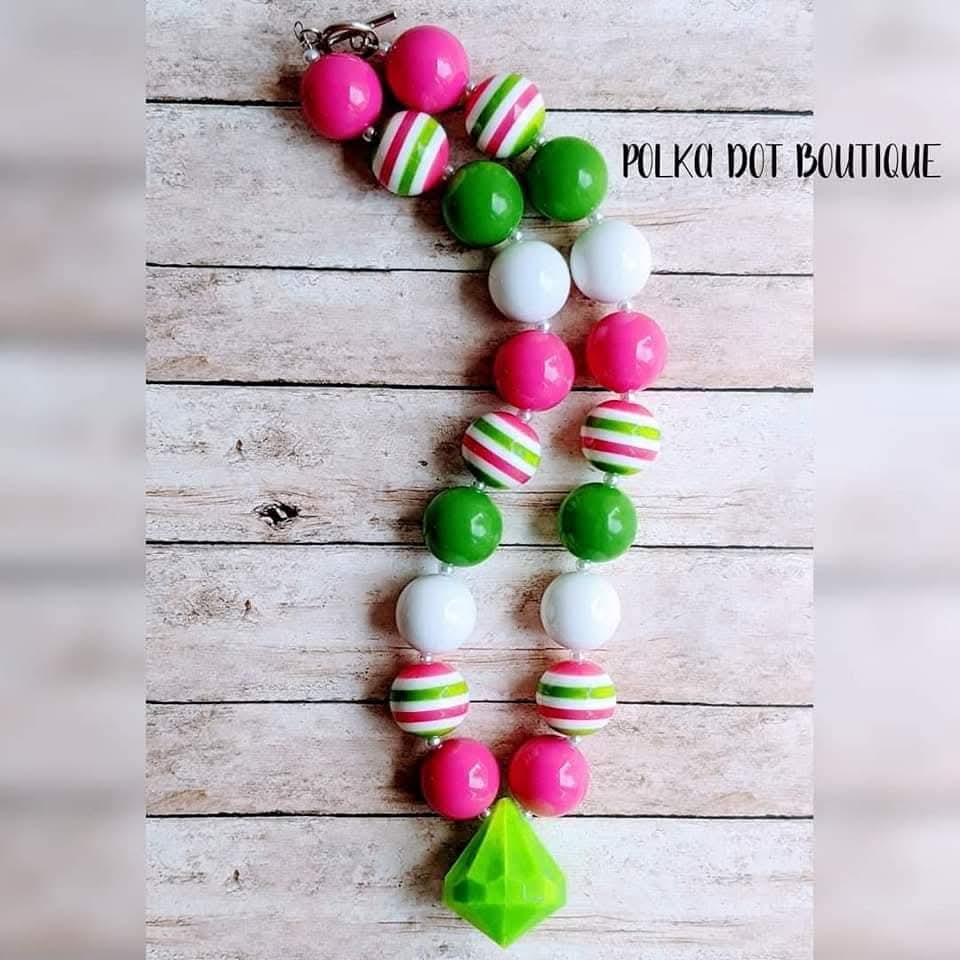 Our adorable chunky necklaces range from 8mm - 22mm in size. They are acrylic base beads. They are secured nicely on a wire with 2 crimp beads on each side. A toggle attachment is also placed on necklace to hold necklace together while being worn. If you have chosen a piece that has a clay piece on it : all clay pieces are handmade pieces and can break if not worn properly . These are very delicate and if worn by a child it is advised that that child be under proper adult supervision due to high risk choking hazard.
