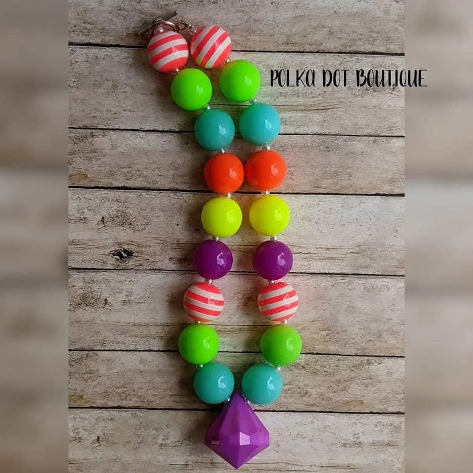 Our adorable chunky necklaces range from 8mm - 22mm in size. They are acrylic base beads. They are secured nicely on a wire with 2 crimp beads on each side. A toggle attachment is also placed on necklace to hold necklace together while being worn. If you have chosen a piece that has a clay piece on it : all clay pieces are handmade pieces and can break if not worn properly . These are very delicate and if worn by a child it is advised that that child be under proper adult supervision due to high risk choking hazard.